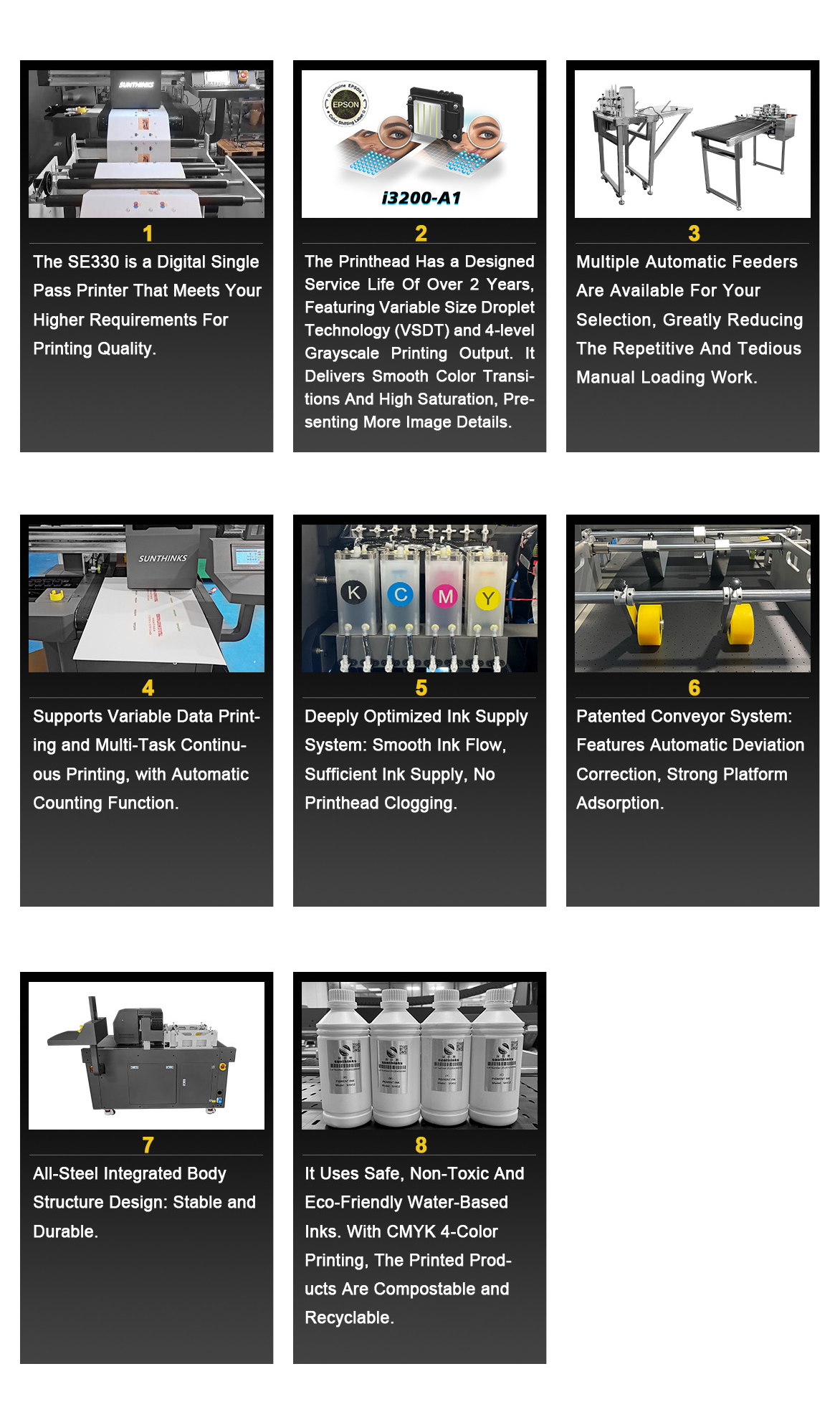 Sunthinks SC300 single-pass printer is a small direct-to-print packaging solution with higher printing quality.Whether you’re scaling an existing packaging business or starting fresh, Sunthinks offers a turnkey single pass printing solution that delivers vibrant, C/M/Y/K 4-color results on demand.SE330 can help you quickly start your printing business of paper bags/paper boxes/cartons/wood boards/and other porous packaging materials.