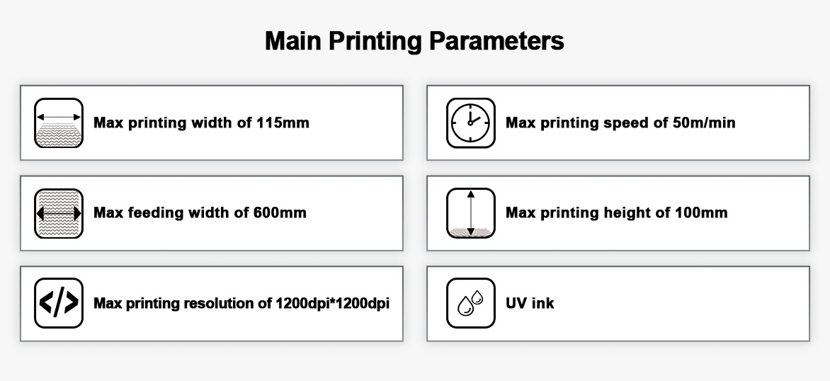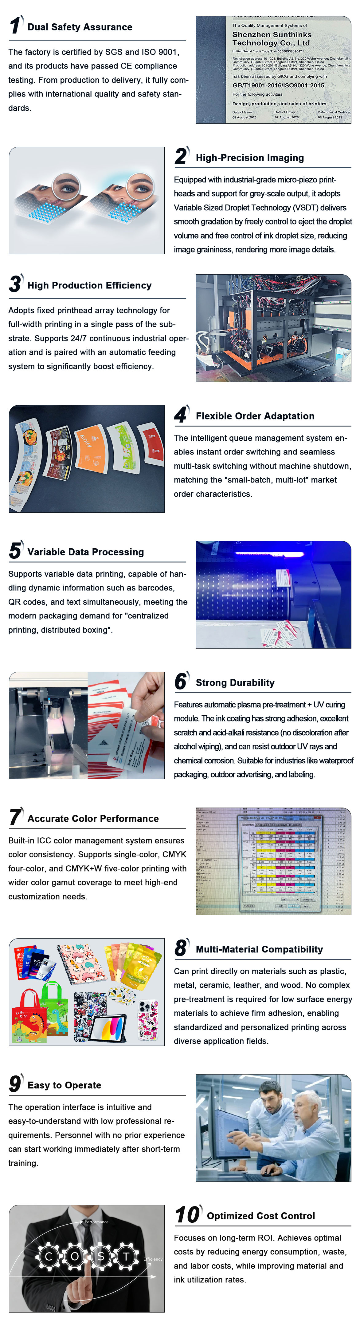 The SU115 UV single-pass printer is Sunthinks' smallest high-speed single-pass printing device, suitable for printing a variety of small-sized materials, such as business cards, metal sheets, notebook covers, street flyers, brochures, handheld billboards, candy sealed bags, pencil cases, card holders, corporate promotional gifts, and other materials in batch printing and personalized customization.